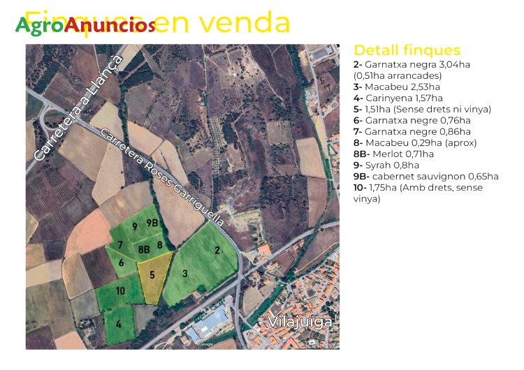 Se venden conjunto de fincas rústicas, la mayorÃa con derechos de viña en el municipio de vilajuïga. Todas son colindantes y muy bien situadas a la entrada del pueblo. Cuentan con pozo.