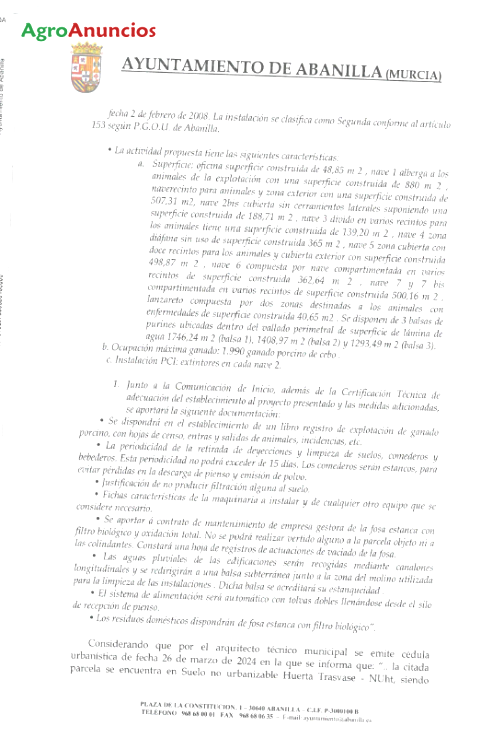 E vende granja de cerdos de 2000 plazas autorizadas de cerdo blanco y caben 1600 ibericos. Arreglando una de las naves se llegaria a los 2000 ibericos. En abanilla pedanía de mafraque. Poligono 26, parcela 66 construcción en 5 naves 3482.54 metros, almacen y vestuarios. Bascula para camiones. Molino de piensos antiguo y en deshuso pero con los silos aun. Balsa de agua tapada 150.000litros. Toda la obra legalizada. Cebadero cerdos. Agua comunidad de regantes concesión.