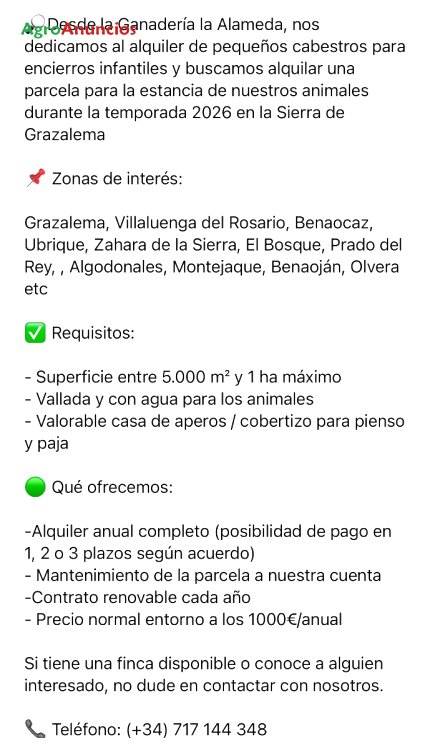 Requisitos: - superficie entre 5.000 m² y 1 ha máximo - vallada y con agua para los animales - valorable casa de aperos / cobertizo para pienso y paja