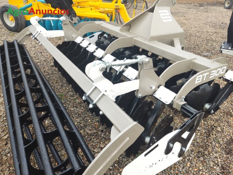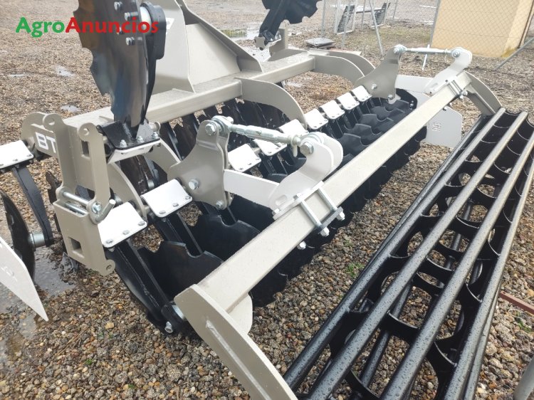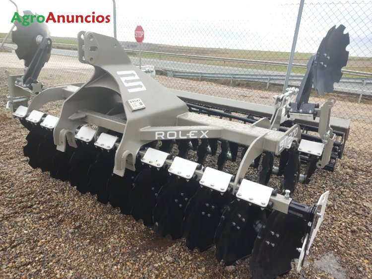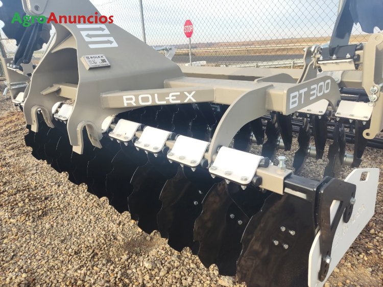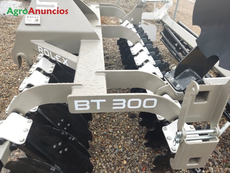 Grada rápida marca rolex, modelo bt300, de 3 metros de trabajo, con 24 discos 610x6 mm, bujes blindados sin mantenimiento, enganche rápido, rodillo de barras de 500 mm, elastómeros de goma, pantallas laterales. Pesa 1.380 kg. Iva no incluido. Disponible en stock.