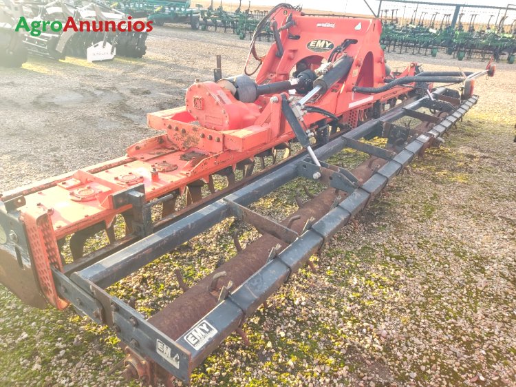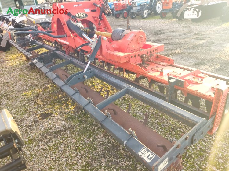 Grada rotativa emy elenfer, de 6 metros de trabajo, plegable para el transporte, tabla niveladora, borrahuellas, con rodillo de puas y regulación hidráulica.