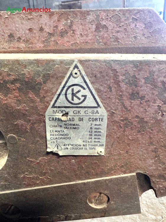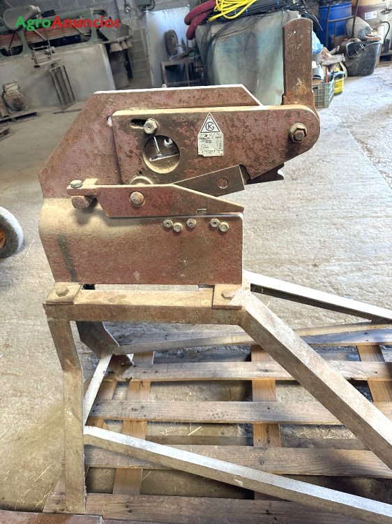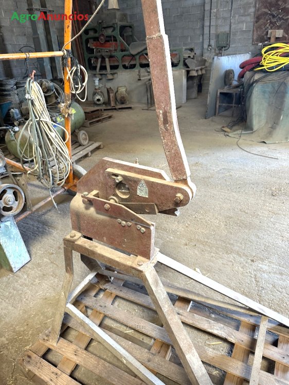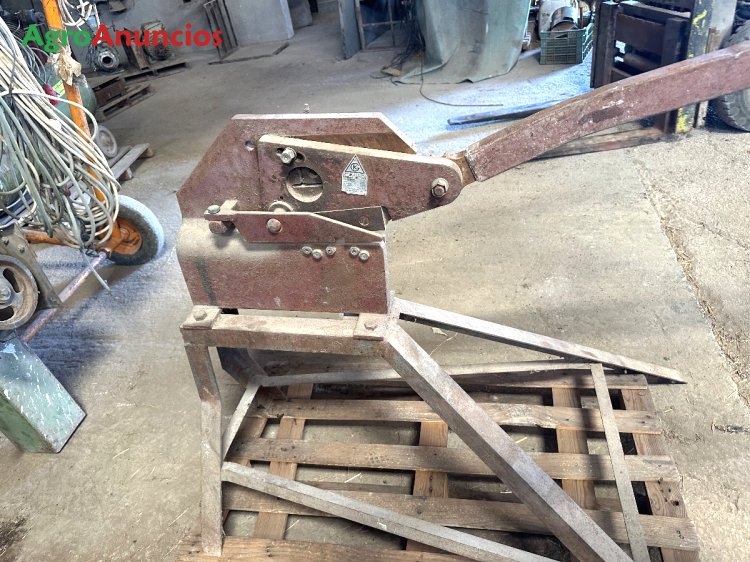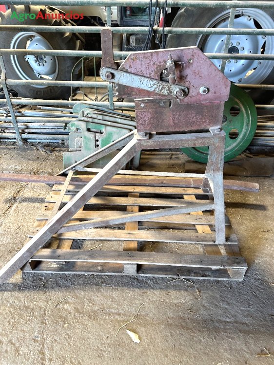 Cizalla de prensa manual para cortar. Se encuentra montada sobre un caballete metálico .