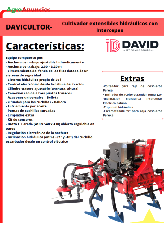 Oferta única de un cultivador extensibles hidráulicos con intercepas modelo davicultor , especialmente diseñados para un laboreo integral en viñedos y frutales.
